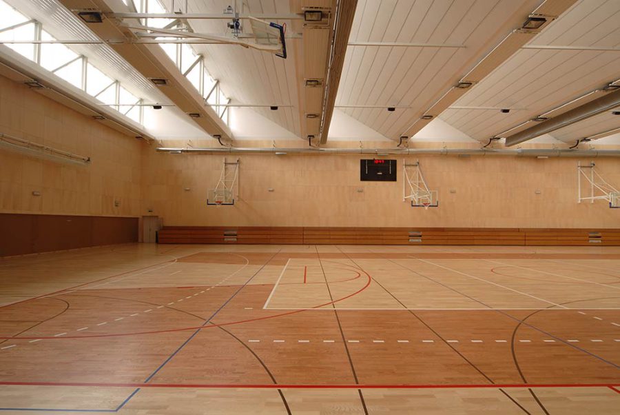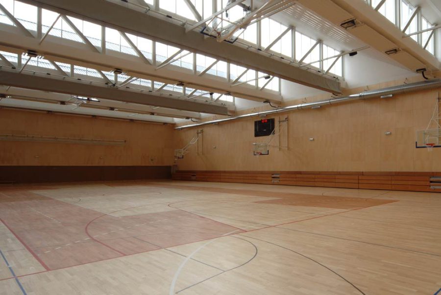 Športno dvorano si delimo s sosednjo šolo, Biotehniškim izobraževalnim centrom Ljubljana. Veliko dvorano je možno razdeliti na tri dele, kjer poteka pouk športne vzgoje. Izvajamo lahko igre z žogo, predvsem odbojko, košarko, nogomet z majhnimi goli in floorball. Na voljo imamo pripomočke za razne poligone, vadbo za moč oz. krožno vadbo ter opremo za gimnastiko, kot so blazine za talno gimnastiko, nizke in visoke gredi, koze in skrinje za naskok in preskok in malo prožno ponjavo oz. trampolin. Pri pouku igramo tudi namizni tenis, badminton ali pa se preizkusimo v hitri igri speedmintona.